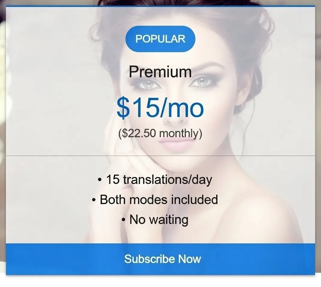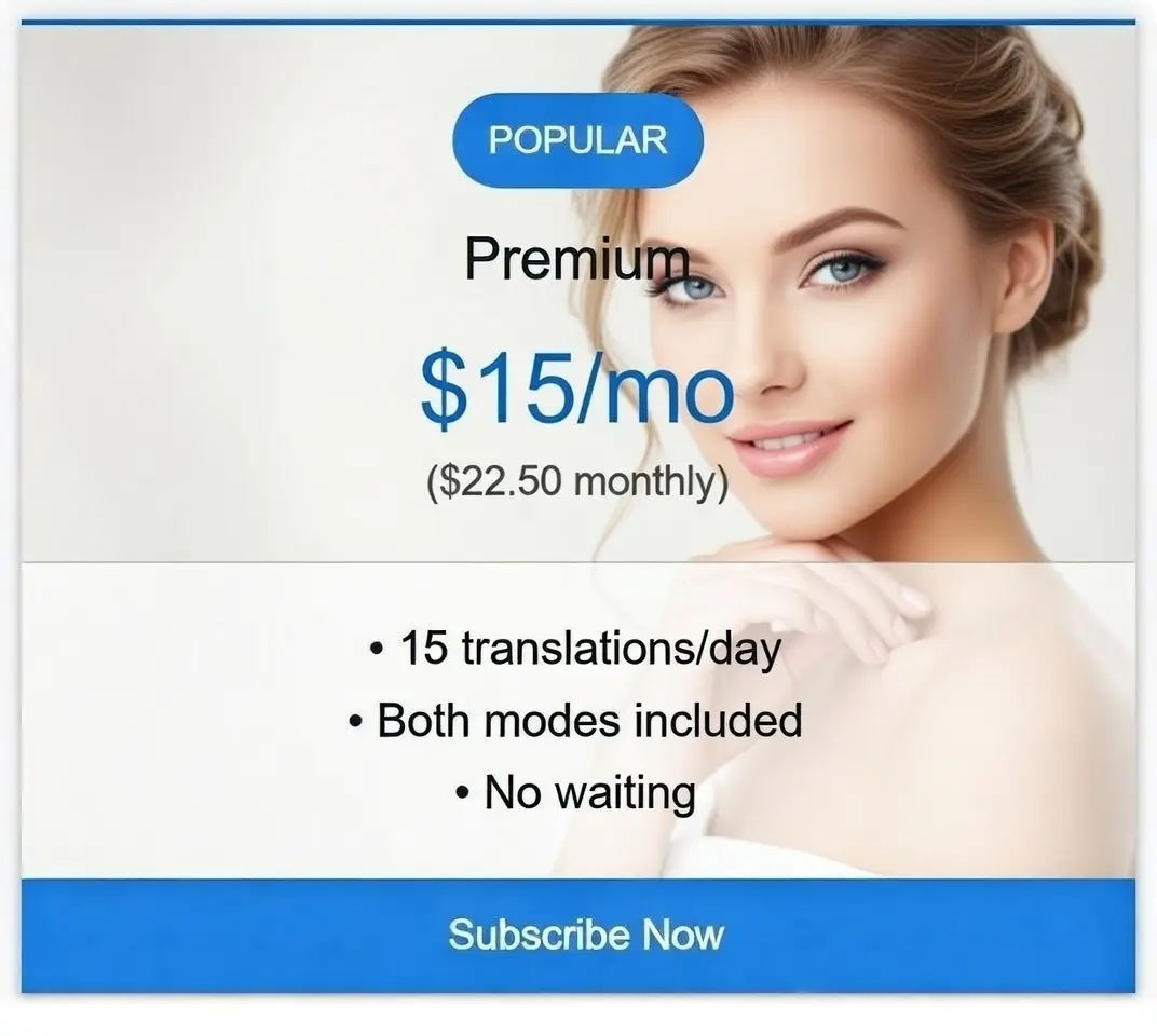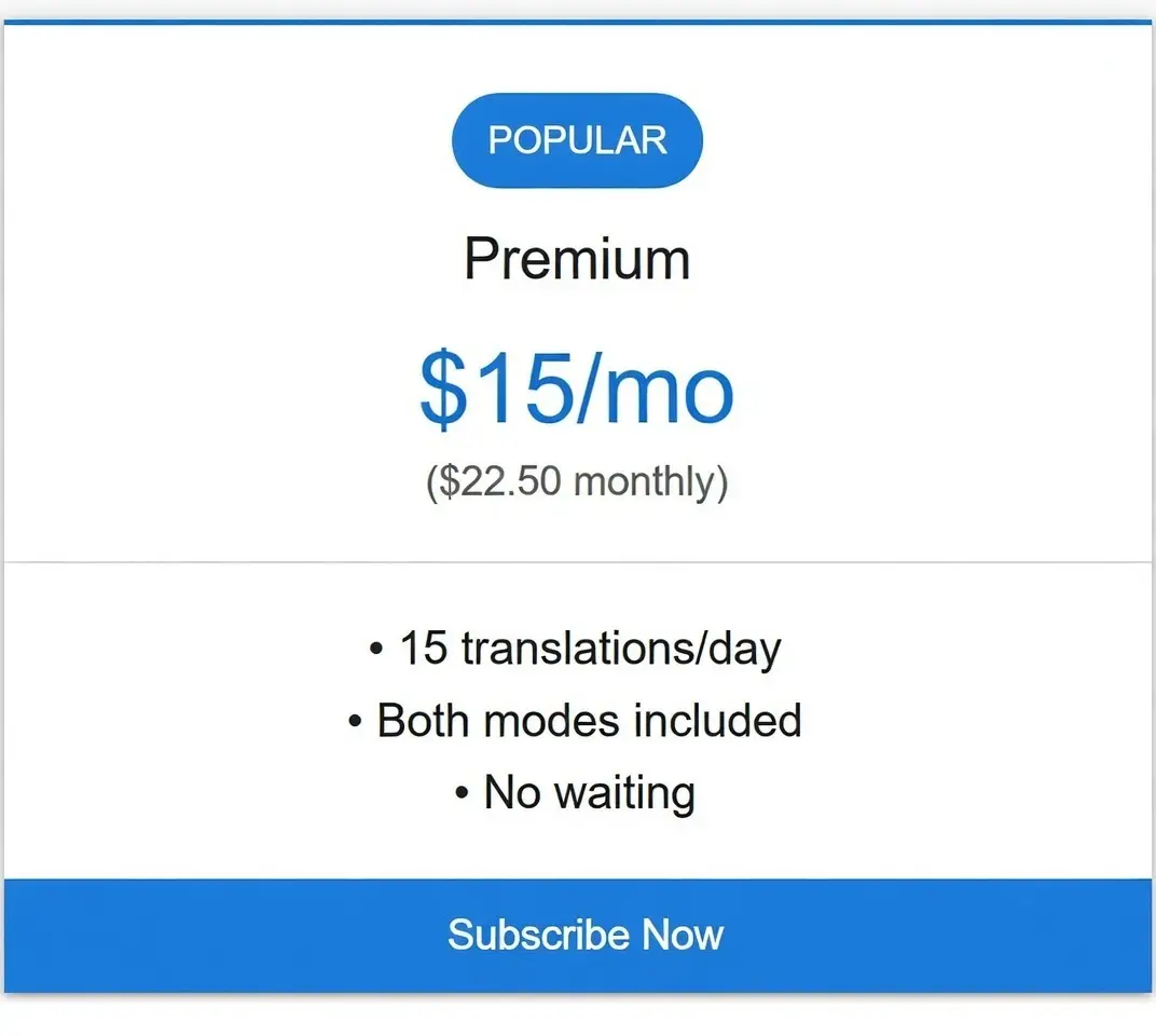15 translations/day • Both modes included • No waiting (Annual Subscription)